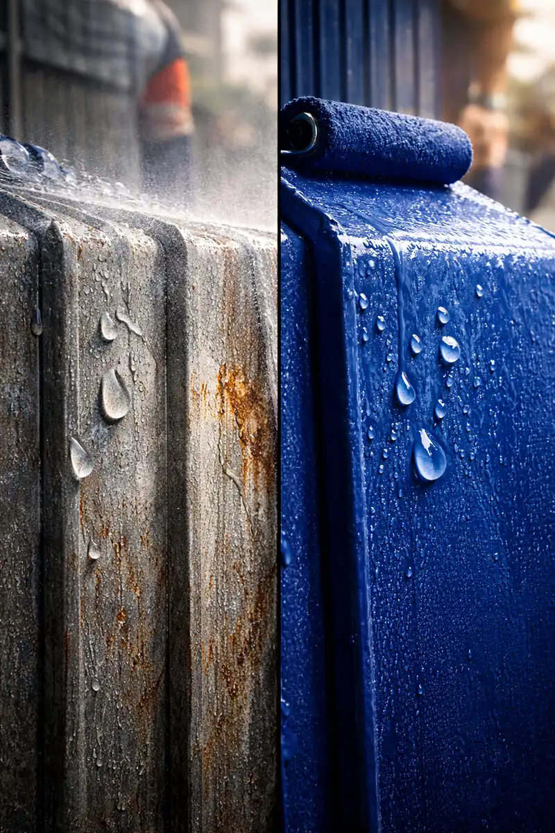 Notre application au rouleau dépose mécaniquement 200g/m². La différence n'est pas cosmétique. Vous obtenez un film trois fois plus épais, qui encaisse mieux les UV, résiste davantage aux variations thermiques (le métal peut passer de -10°C l'hiver à +60°C en été sous le soleil), et protège plus longtemps contre l'humidité.