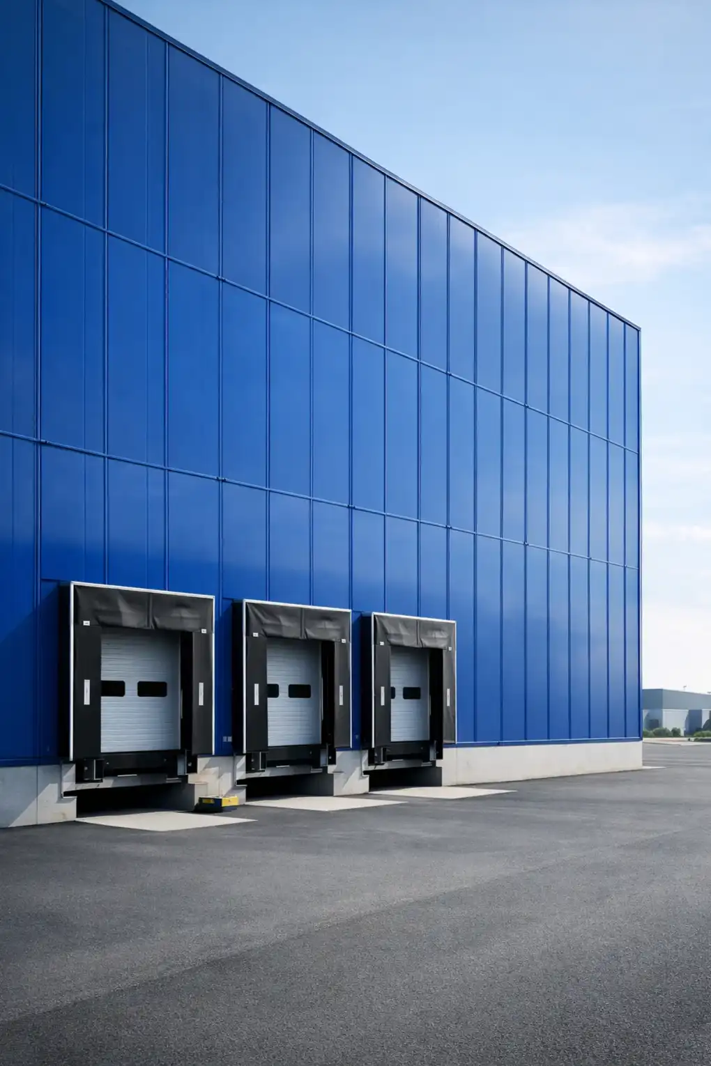 Un entrepôt logistique de 4 200 m² de façade, construit en 1998, situé en zone d'activité du Mans Sud. Le bardage d'origine (RAL 5010 bleu gentiane) présentait un farinage généralisé côté sud et ouest. Des traces de rouille superficielle apparaissaient sur les fixations et points singuliers (acrotères, soubassements).