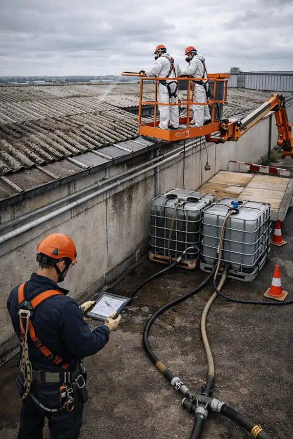 Certains bâtiments industriels au Mans présentent des particularités qui interdisent une intervention standard. Les toitures en amiante-ciment nécessitent un protocole sous-section 4 (SS4) avec cartographie préalable, personnel habilité et suivi médical. Nous ne montons jamais directement sur ces supports fragiles : l'intervention se fait depuis une nacelle ou après installation de plateformes de répartition de charge.