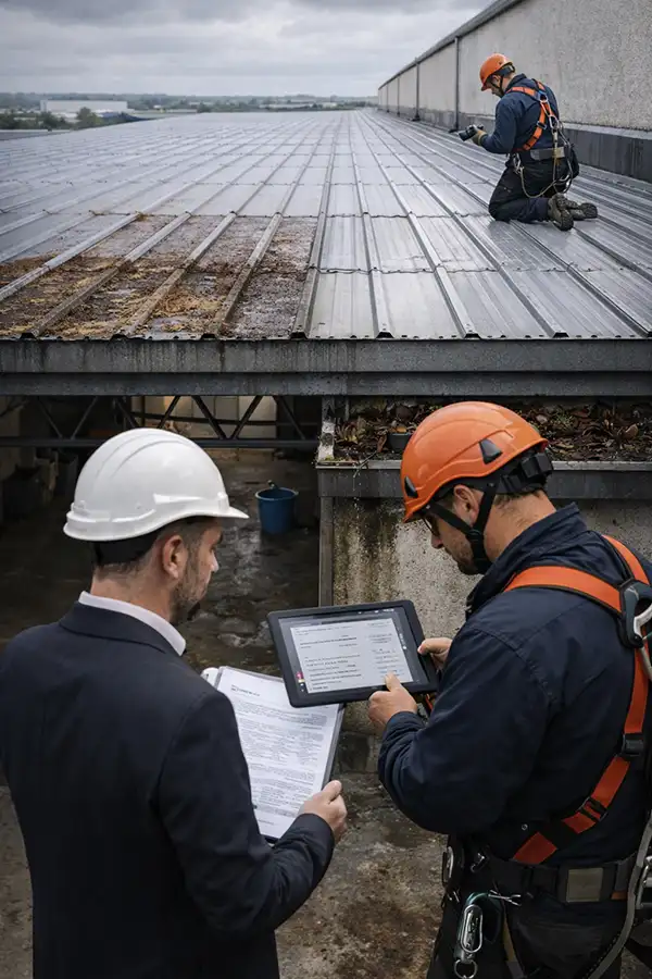 Chaque intervention comprend une inspection visuelle complète de la couverture. Nous identifions les zones présentant des traces d'humidité, des déformations ou des fixations défaillantes. Un rapport photographié est systématiquement transmis avec le bon d'intervention. Cette documentation permet de suivre l'évolution de l'état général et d'anticiper les travaux de réparation avant qu'ils ne deviennent urgents.